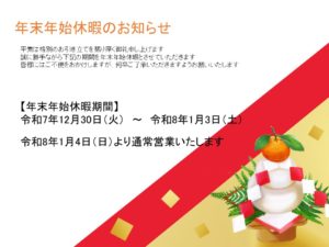 年末年始休業のお知らせ 平素は格別のお引き立てを賜り厚く御礼申し上げます 誠に勝手ながら下記の期間を年末年始休業とさせていただきます。 皆様にはご不便をおかけしますが、何卒ご了承いただきますようお願いいたします。 【年末年始休業期間】 令和7年12月30日(火) ~ 令和8年1月3日(土) 令和8年1月4日(日)より通常営業いたします。 前の記事へ 一覧